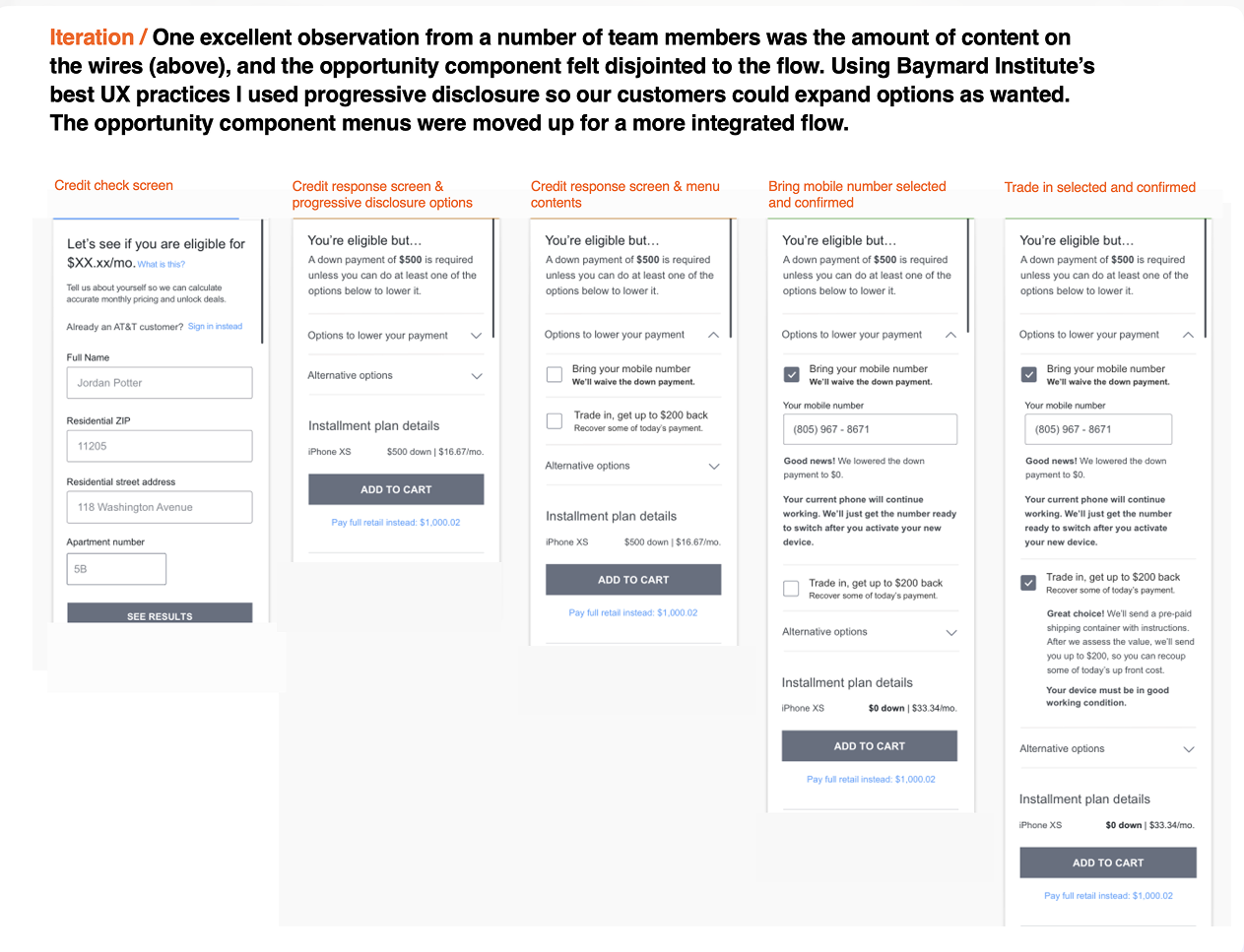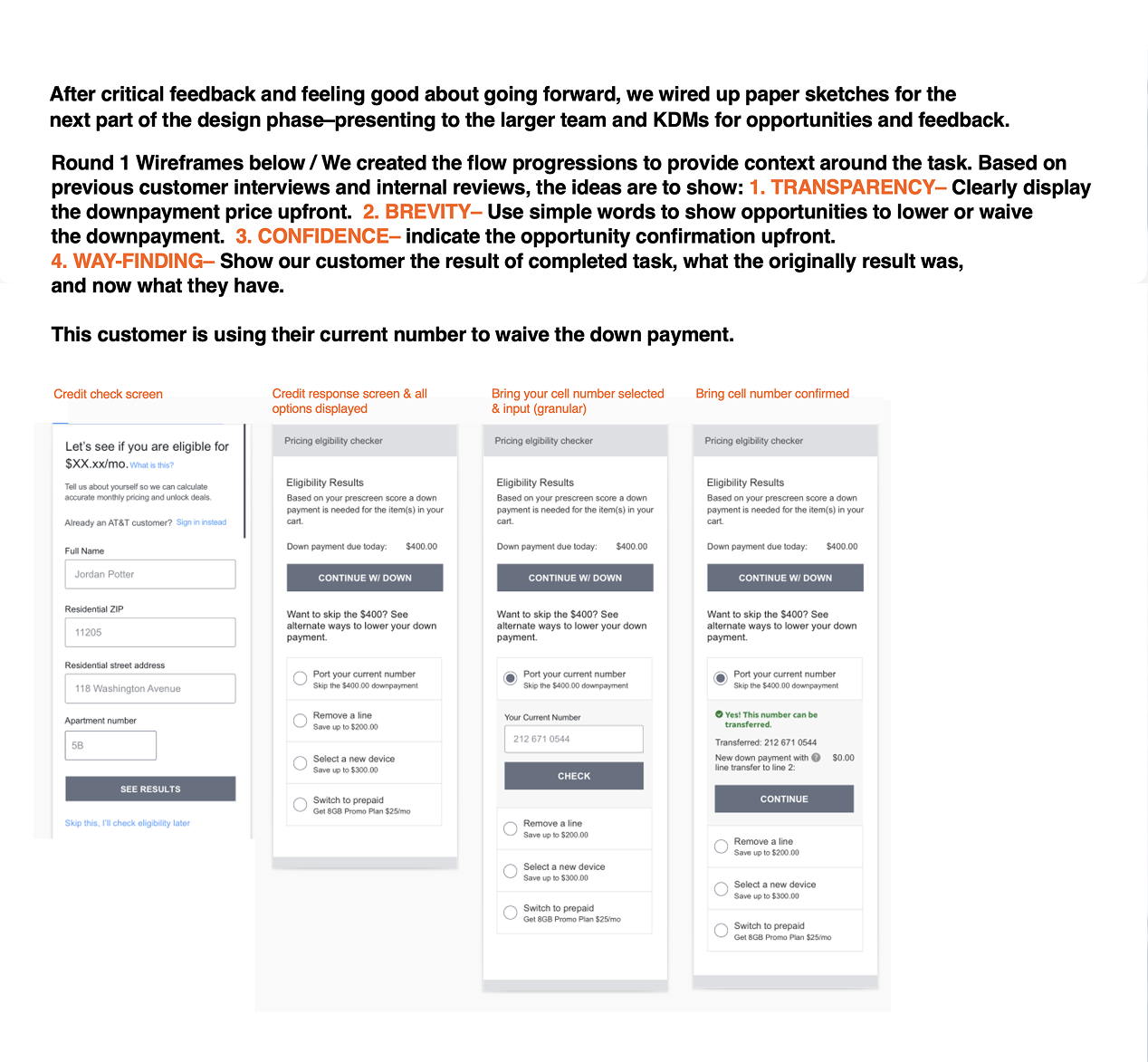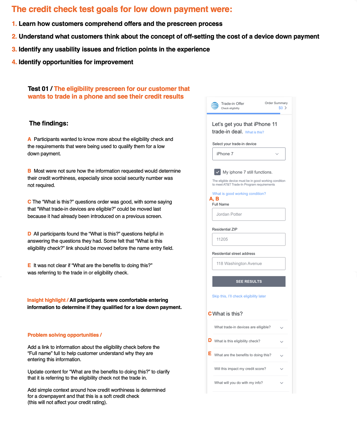 Projected to save AT&T -/+ $10 million annually in fraudulent losses, and generate -/+ $14 million annually by retaining new acquisitions within the buy flow. Completely thrilled would-be new customers (in user-testing) by recommending alternative downpayment and/or mobile device options.